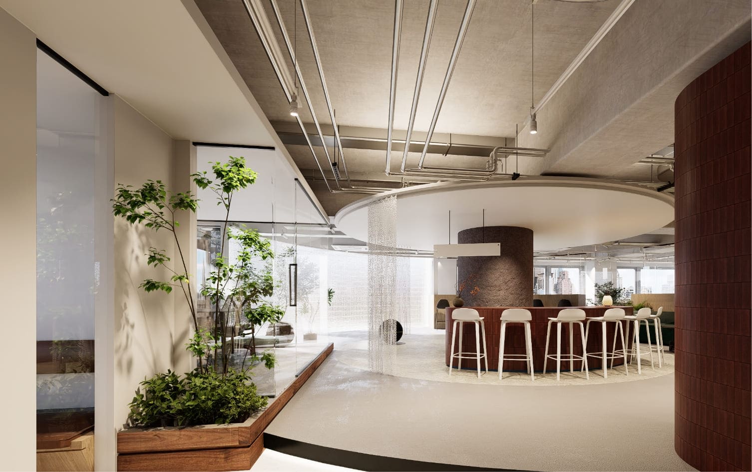 円形ラウンジは使い方に応じて、展示・撮影・交流など多目的に使用でき自由度の高いオフィスです。