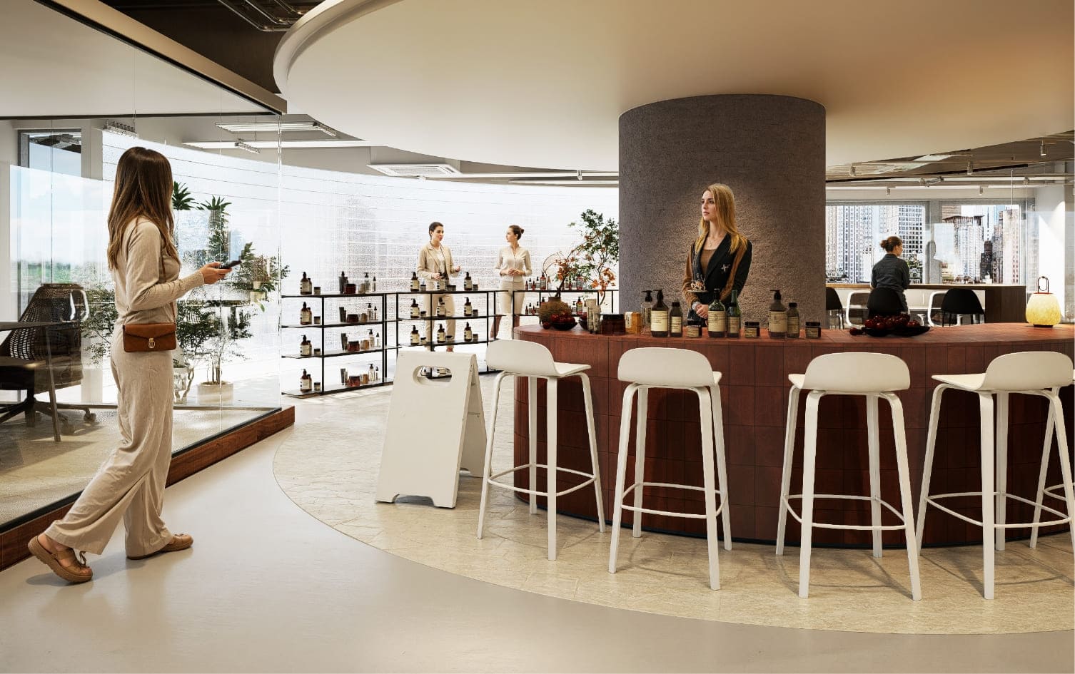 フロア中央に広がる円形ラウンジは使い方に応じて、